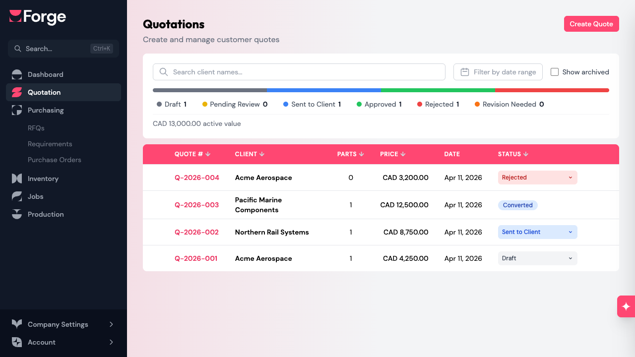 Click the status badge on any quote row to open a dropdown of available transitions. Forge only shows valid next steps — for example, a Draft quote can move to Pending or Sent, but not directly to Approved.